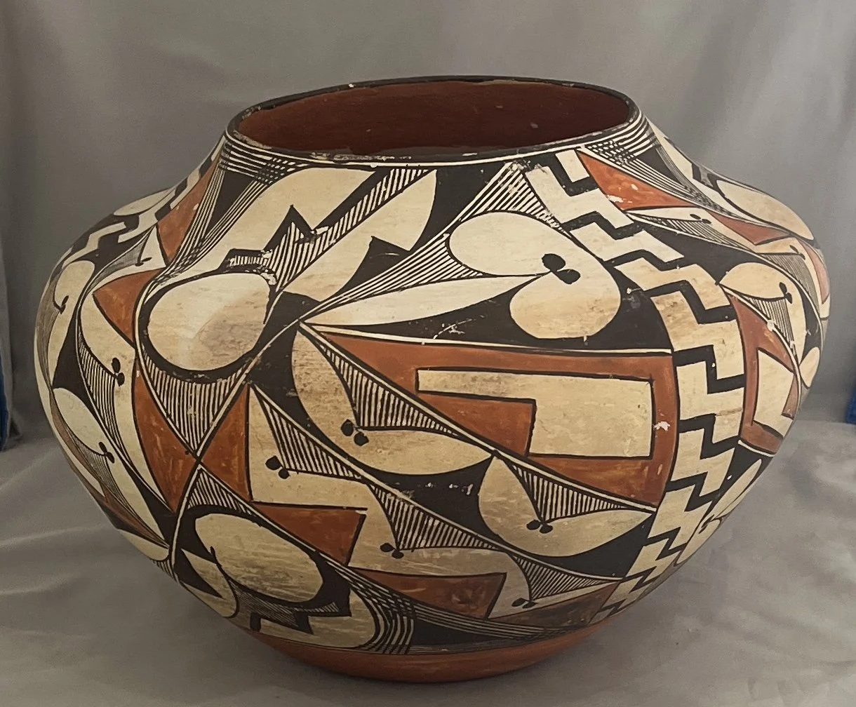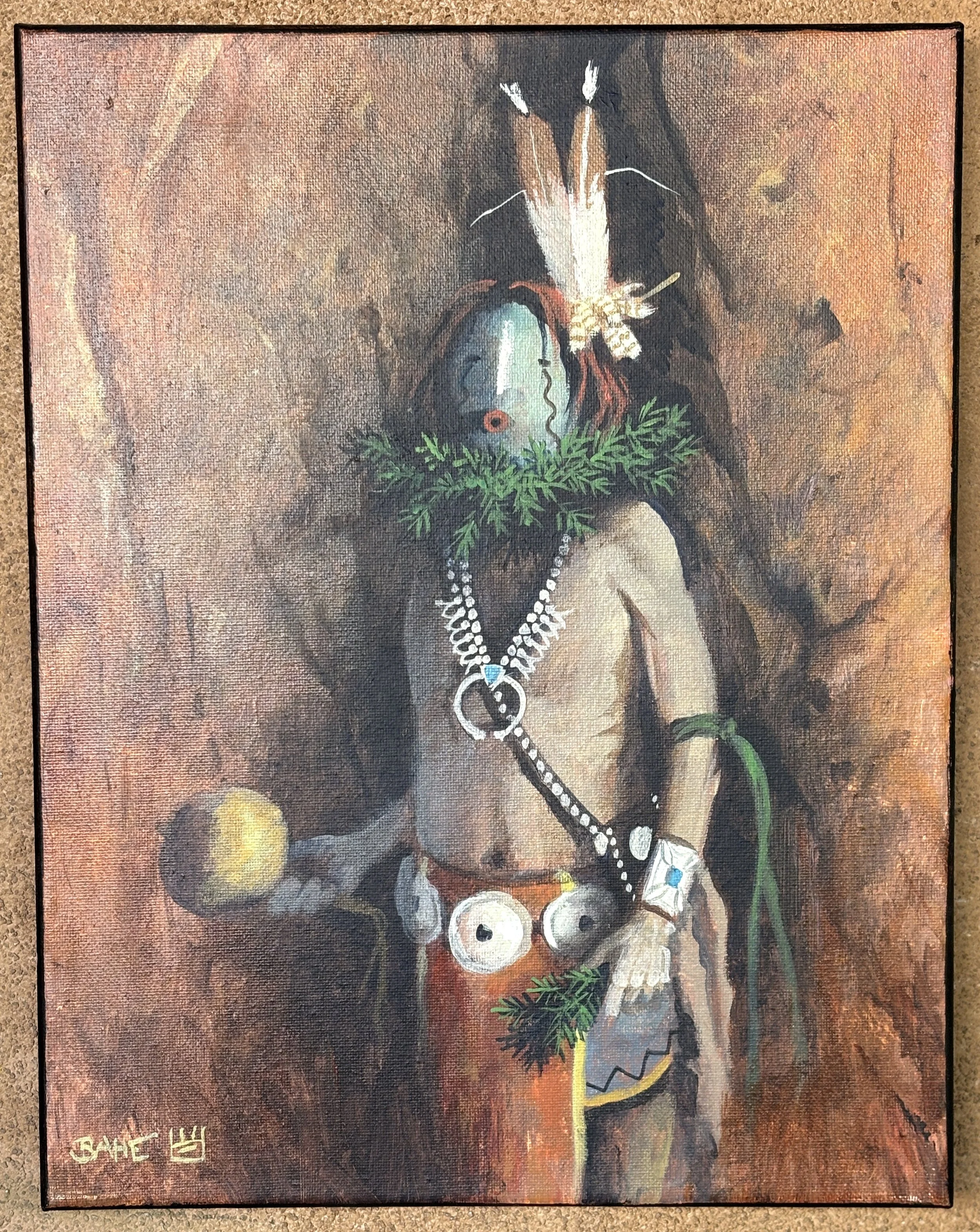 A Pang or Mountain Sheep katsina by Wendell Silas-Yazzie. 11 inches high and $1100. (TUCSON) A beautifully detailed traditional style doll by Ethan Waters, 11.5 inches tall (including base.) He is depicted here as he would appear in one of the summer dances - with gifts for both boys and girls. $800. (SANTA FE) This beautiful Corn katsina was made by famed Hopi artist Manfred Susunkewa. ca. 2021. It is 13 inches high to tallest feather tip. $1,275. (SANTA FE)