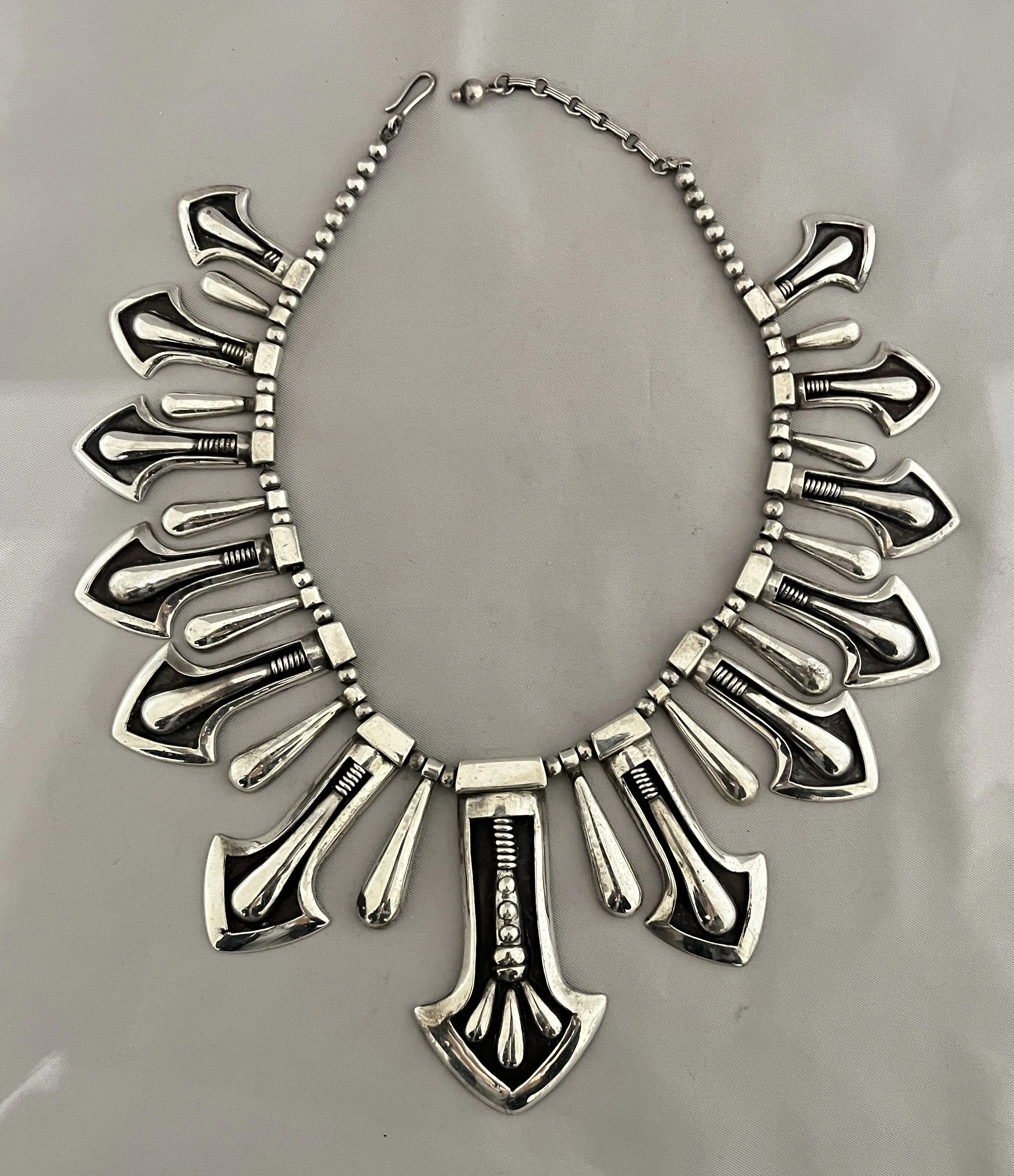 A beautiful repoussé necklace by Frank Patania Sr. marked with both the Thunderbird Shop mark and his personal hallmark, The centerpiece is 3 inches long. Currently the necklace itself id 16 inches long, beads can be added at no charge if the purchaser wishes. $4500.