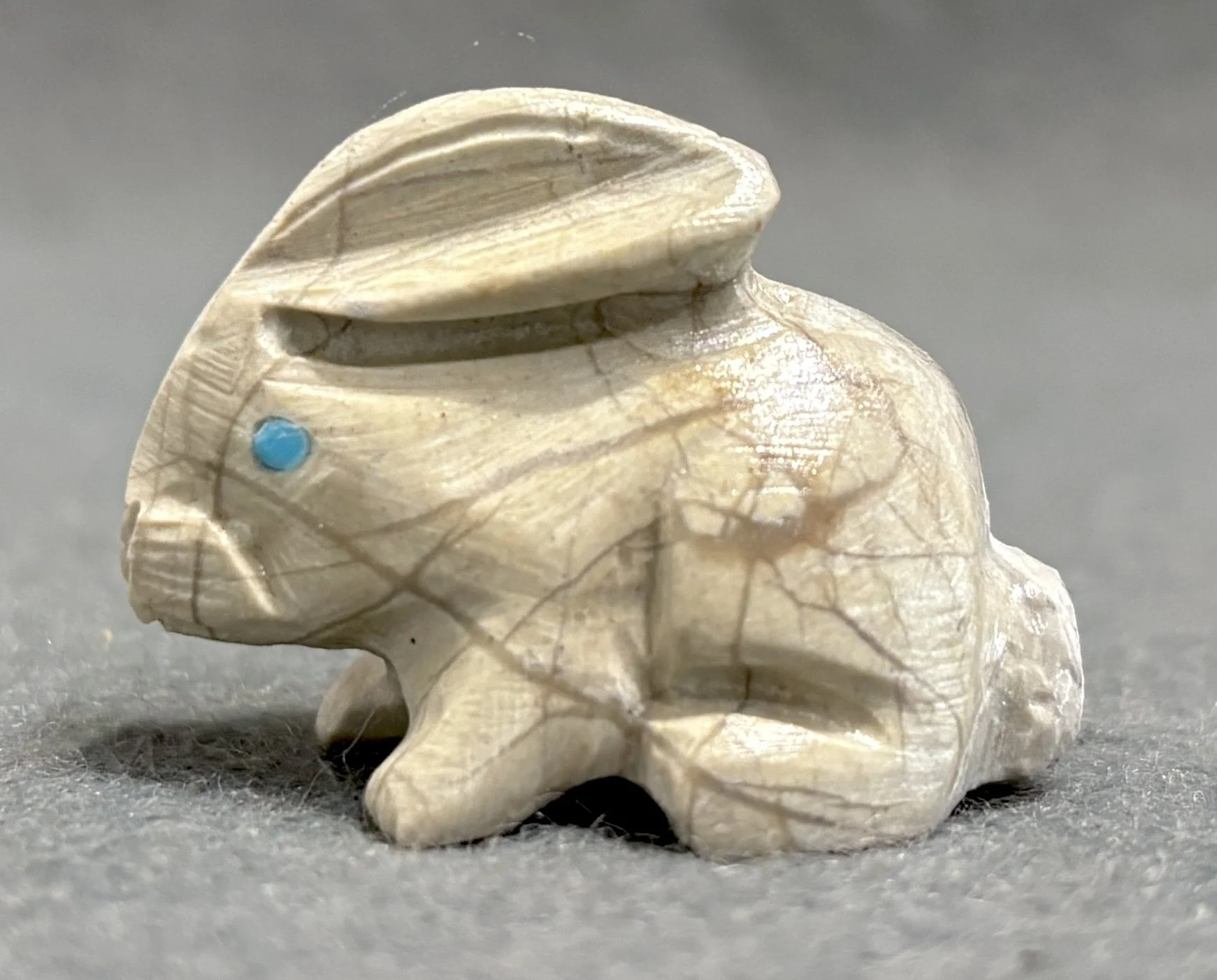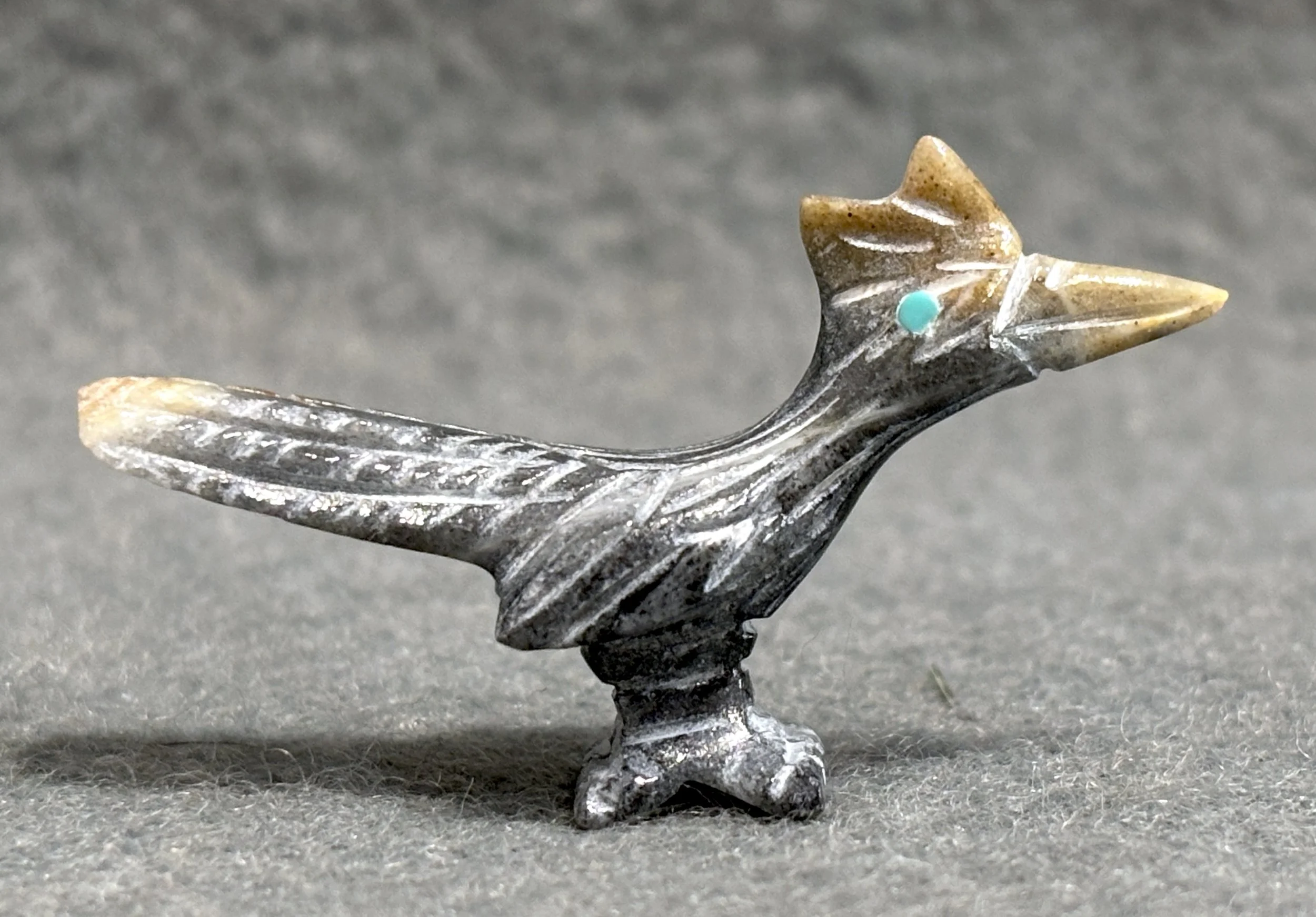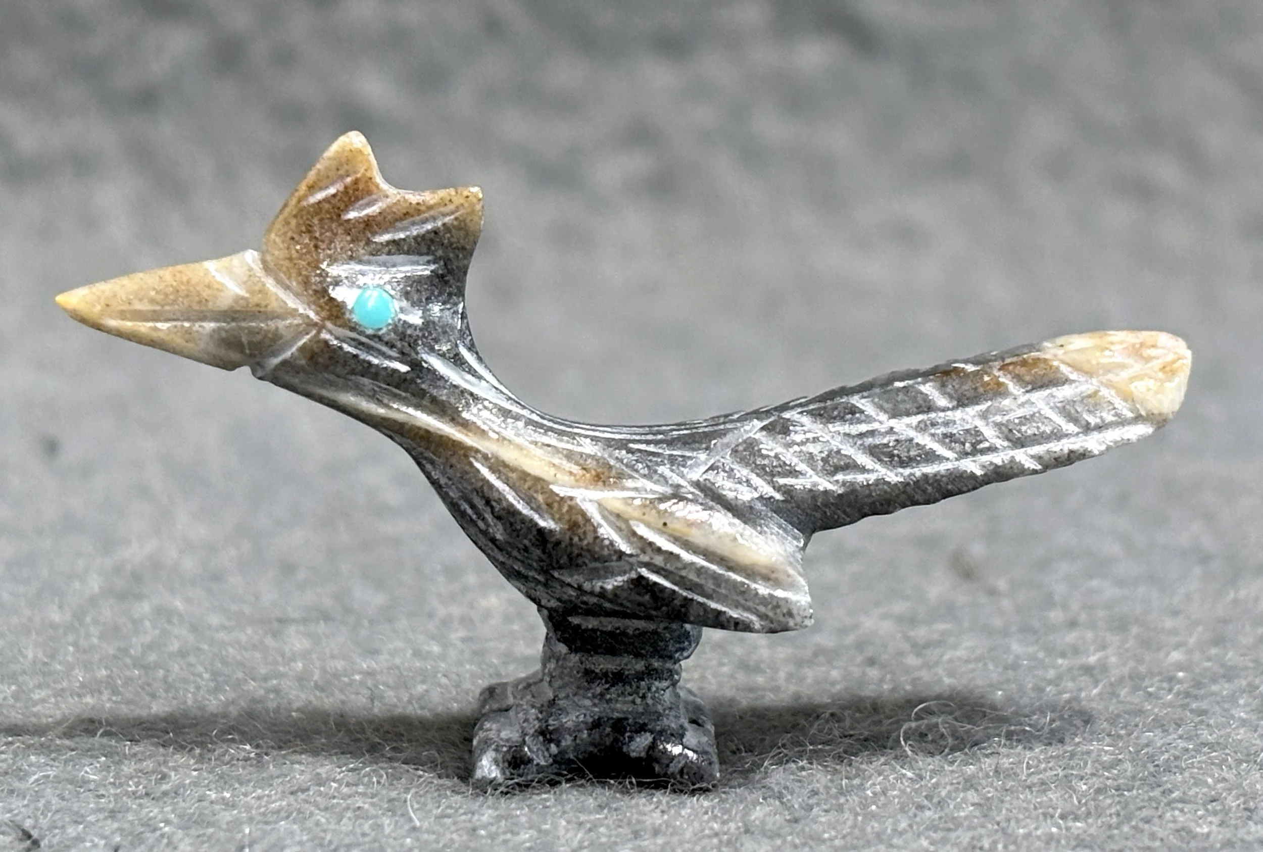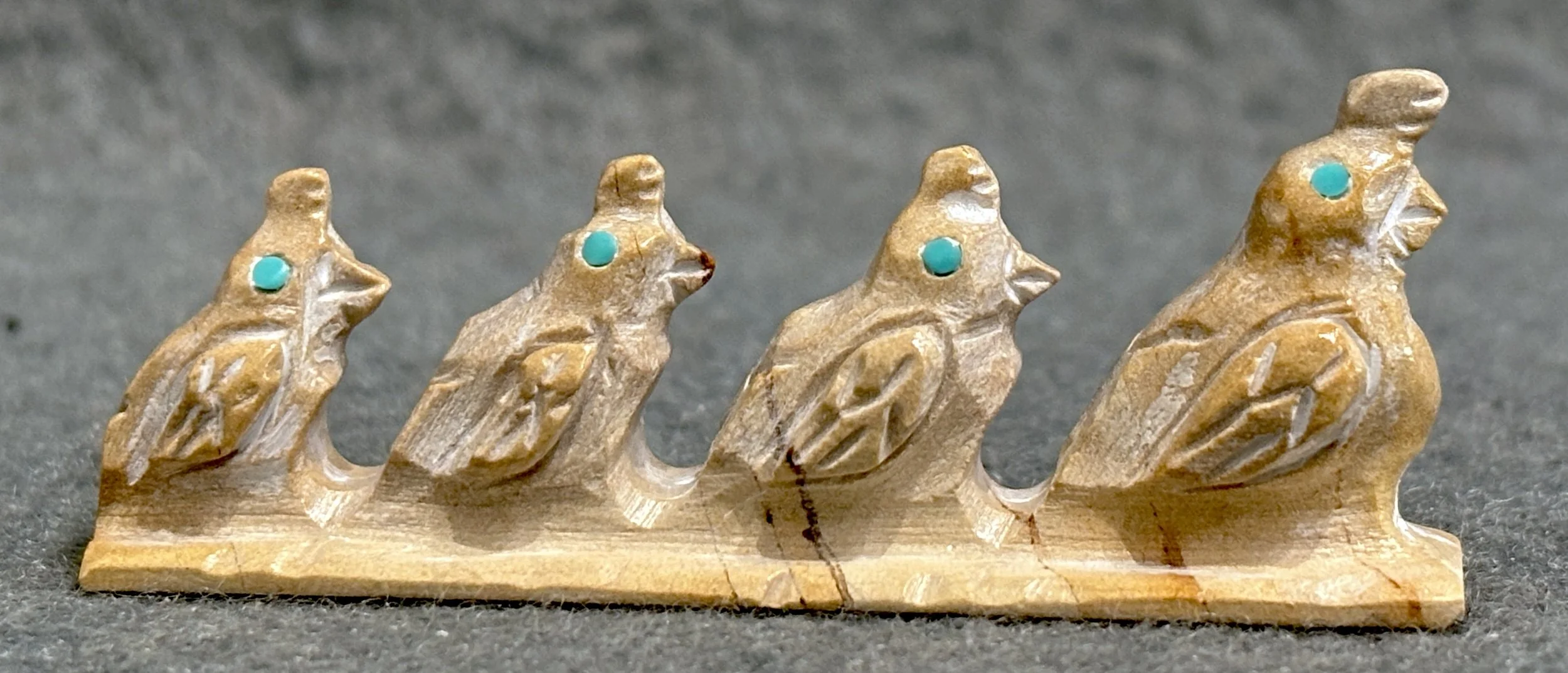 Both of the carvings above are made by Fabian Tsethlikai. The Quail covey is carved from picture jasper and is 2 1/8 inches long. $90. The Picasso marble roadrunner is 1.75 inches long and $42.