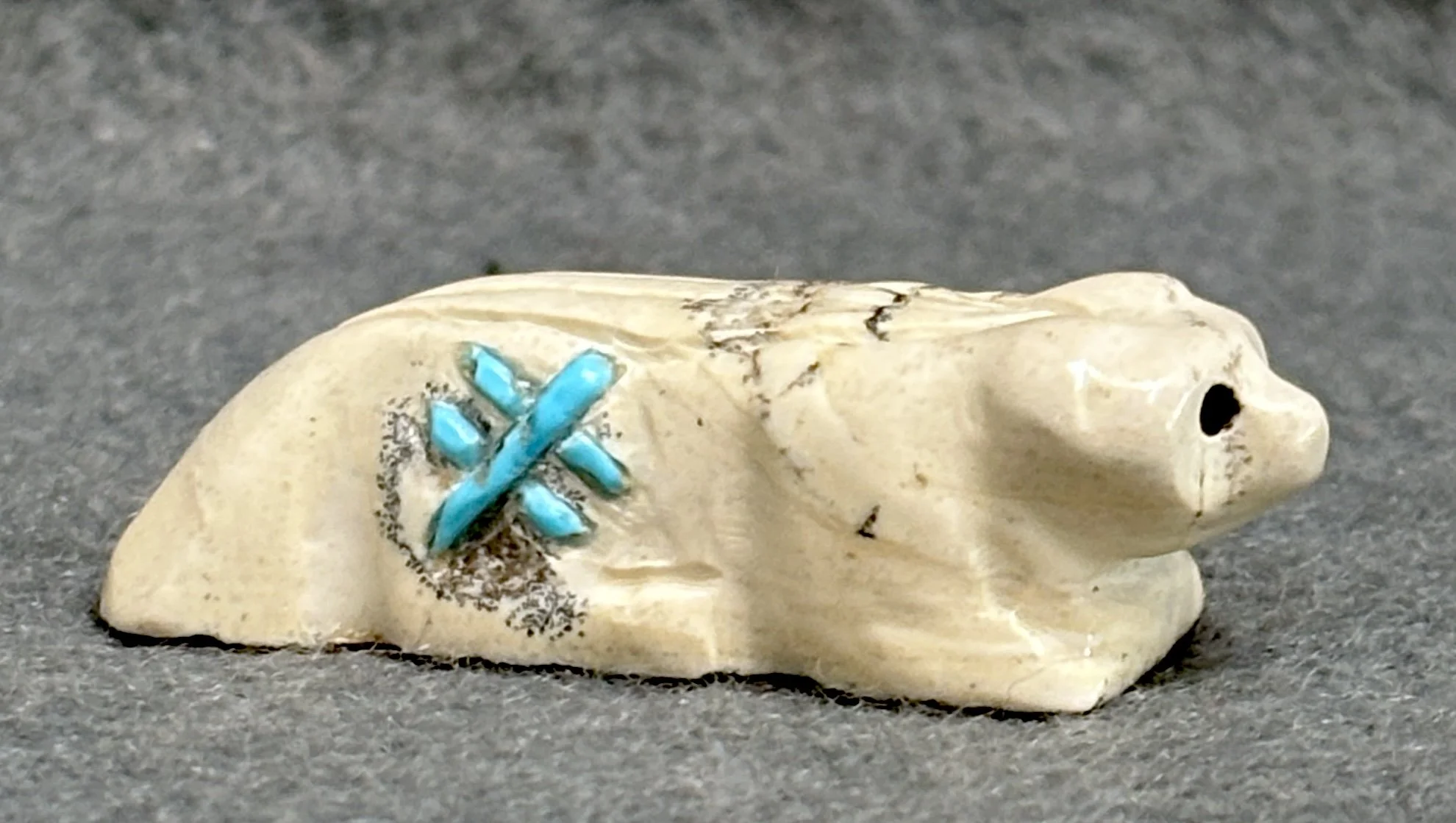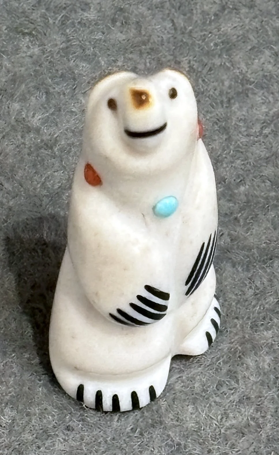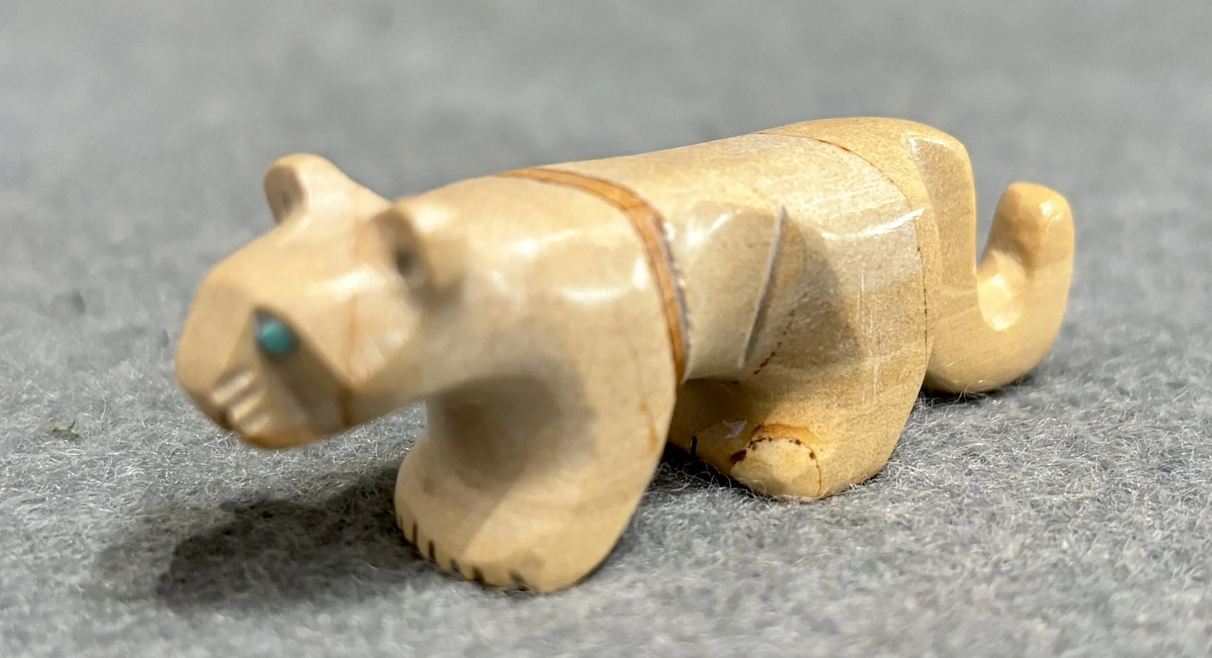 At left are two Zunistone figures carved by Freddie Leekya. The one at left has a bag of turquoise slung on his left shoulder, it is 4.75 inches high and $150. The one at right with his walking stick is 4.25 inches high and $150. The fishing bear, complete with his sterling silver fishing rod, was made by Chris Gchachu. The bear is carved of serpentine, while the fish is a piece of shell. Just under 2.5 inches high and is $250.