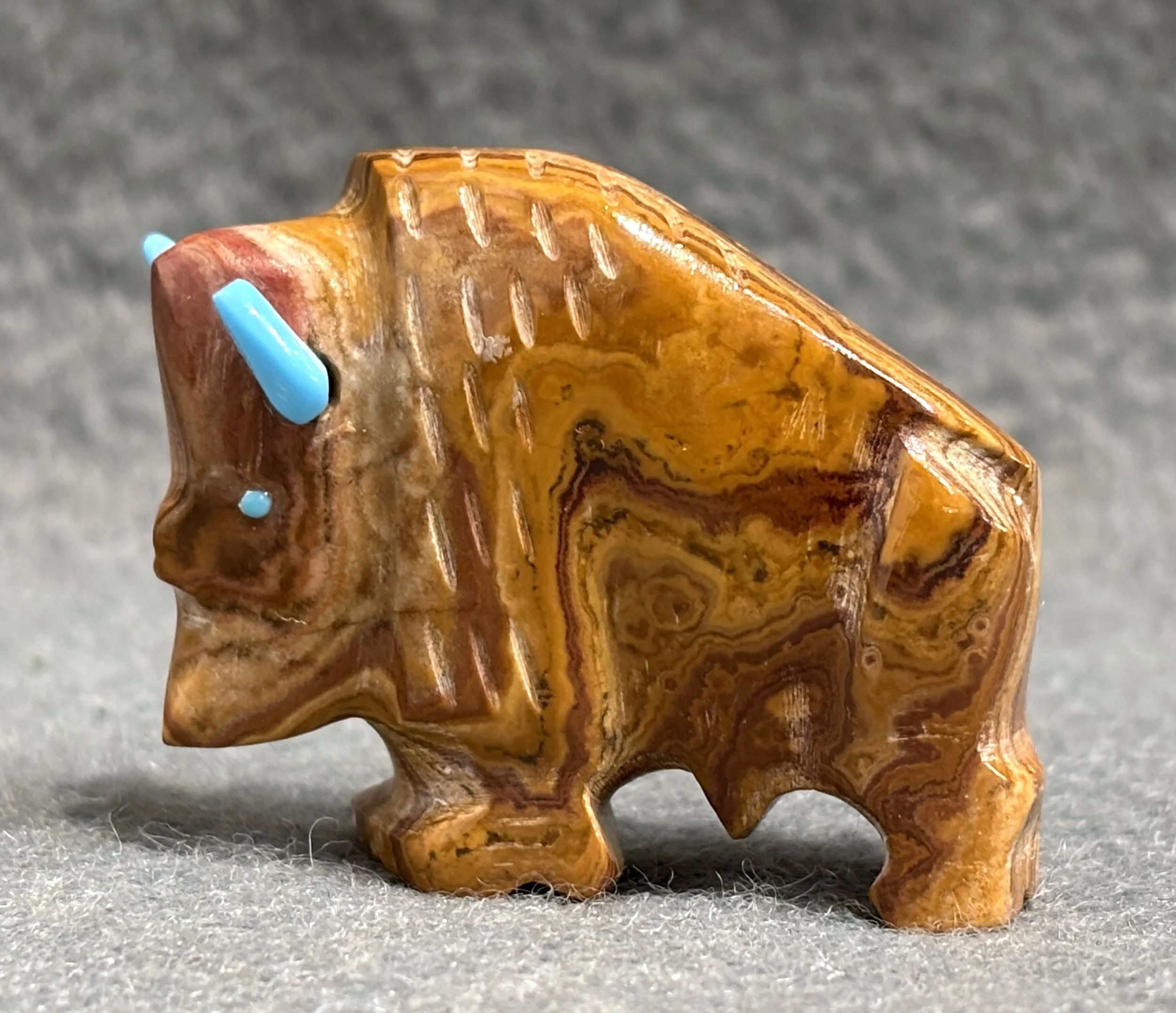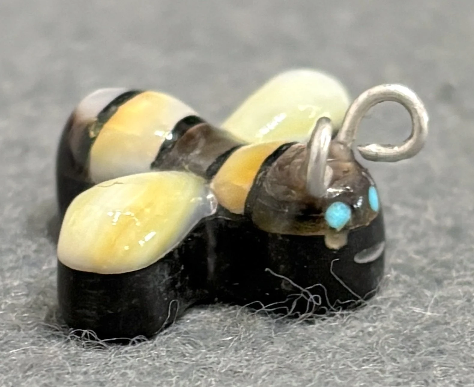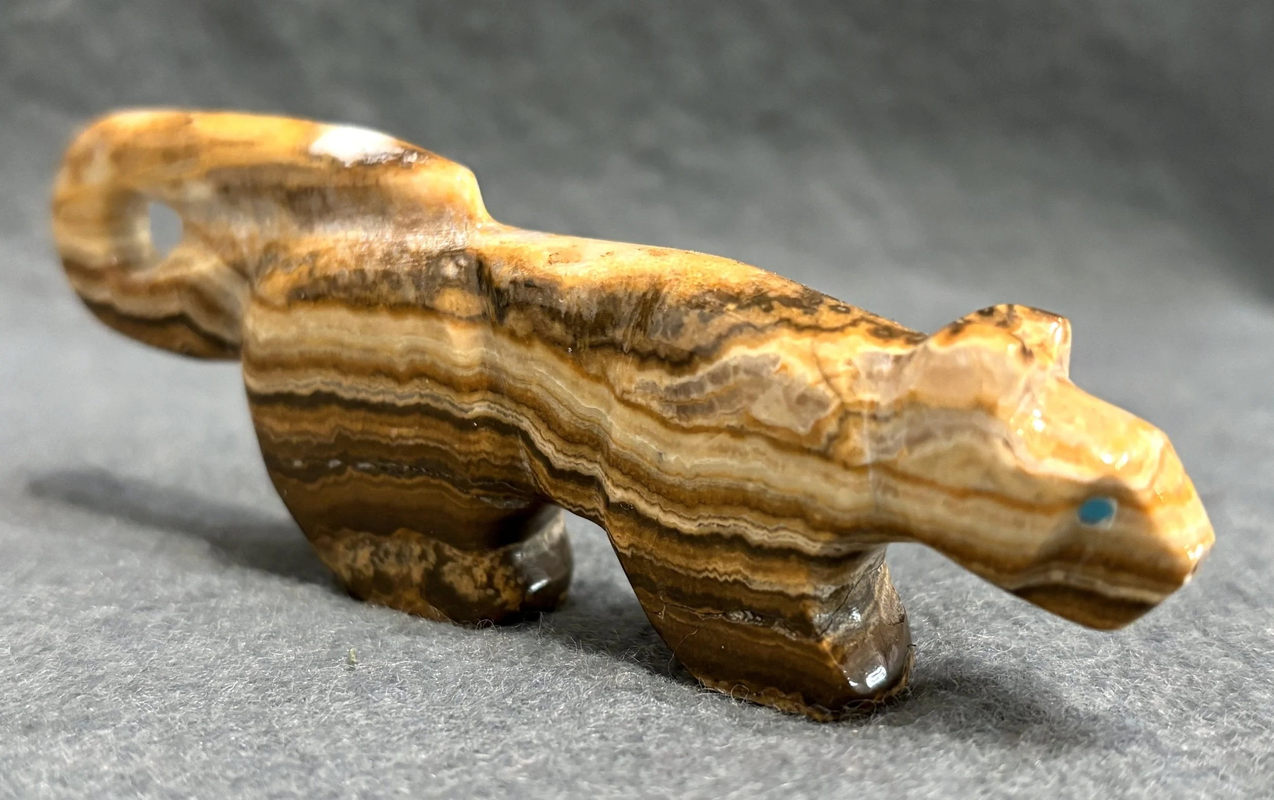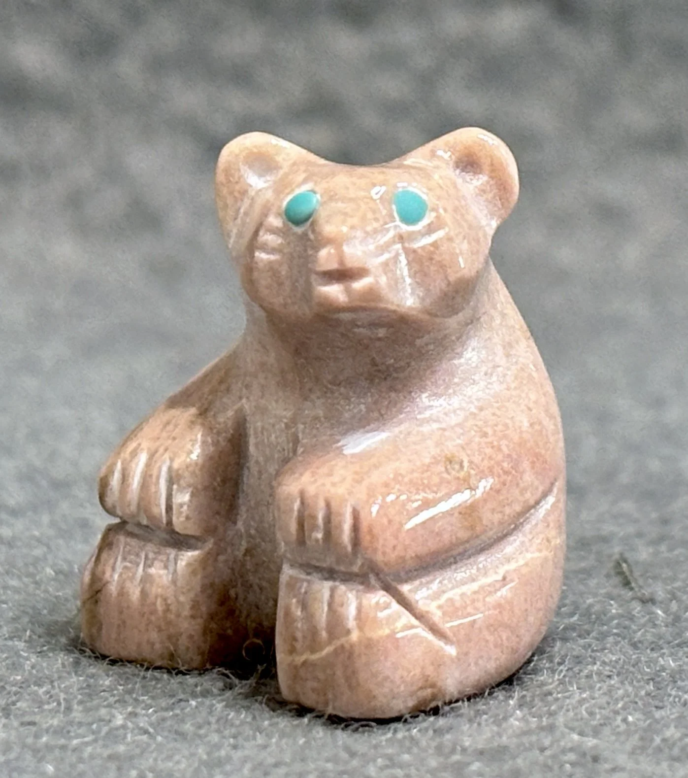 At left are two Zunistone figures carved by Freddie Leekya. The one at left has a bag of turquoise slung on his left shoulder, it is 4.75 inches high and $150. The one at right with his walking stick is 4.25 inches high and $150. The fishing bear, complete with his sterling silver fishing rod, was made by Chris Gchachu. The bear is carved of serpentine, while the fish is a piece of shell. Just under 2.5 inches high and is $250.