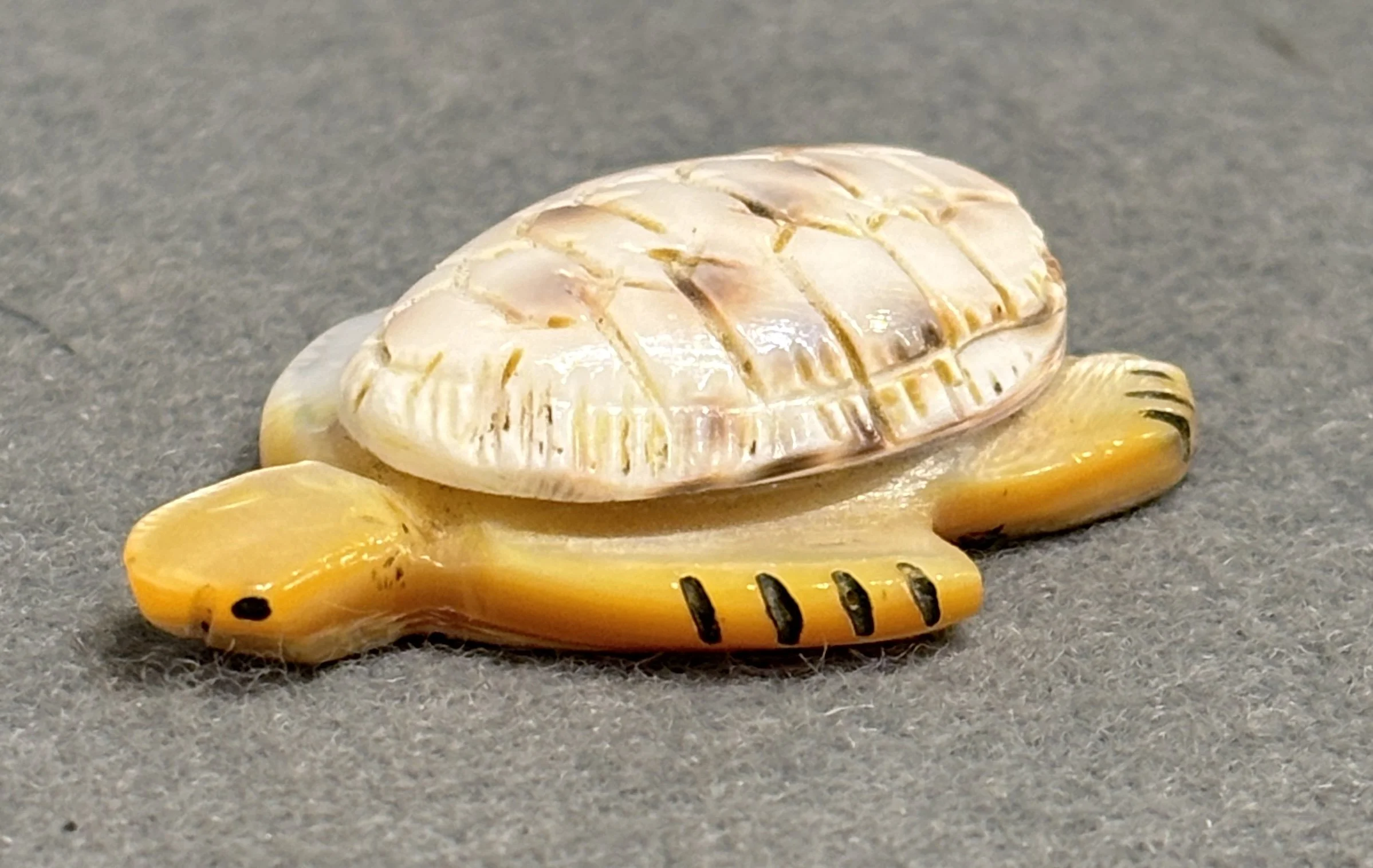 Two views of a horned lizard by Sedrick Banteah. Carved from Picasso marble it is 2 1/8 inches long and $90. Next is an all shell turtle by Darrin Boone, it is 1.75 inches long and $36.