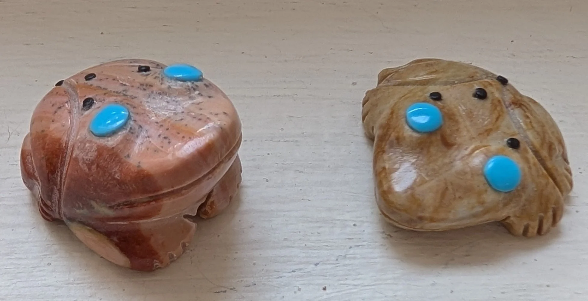 An anter raccoon by Ruben Najera. 1.85 inches long and $60. And an amazing skateboarding raccoon, also by Ruben. 2.25 inches long. Quite the classy skateboard, what with the turquoise wheels! $90. Two photos of a snazzy owl, carved of serpentine by Eddington Hannaweeke. 2 inches long. $90.